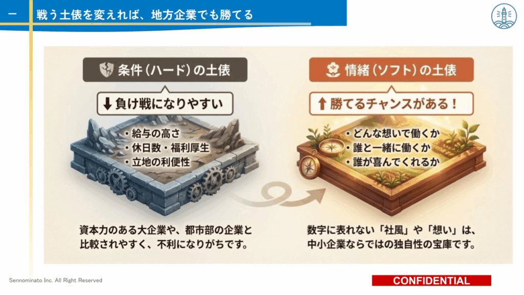 「隣の市の方が便利だ」「大手の方が給料が高い」 この土俵で戦えば、リソースに限りのある地方の中小企業が「負け戦」になるのは当然です。