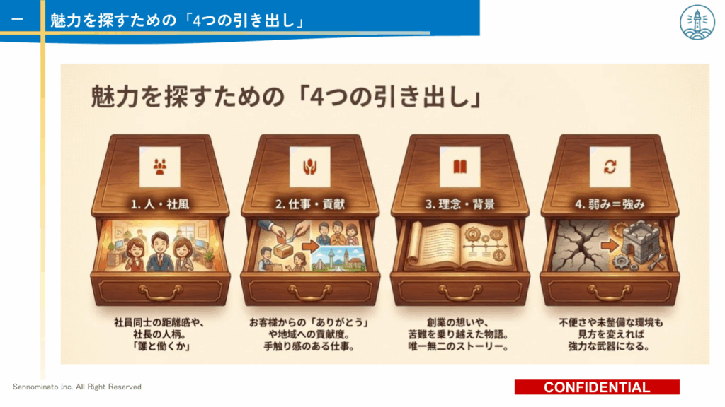 では、具体的にどこを探せばよいのでしょうか。闇雲に考え込んでも答えは出ません。 魅力を探すための地図として、以下の「4つの引き出し」を用意しました。