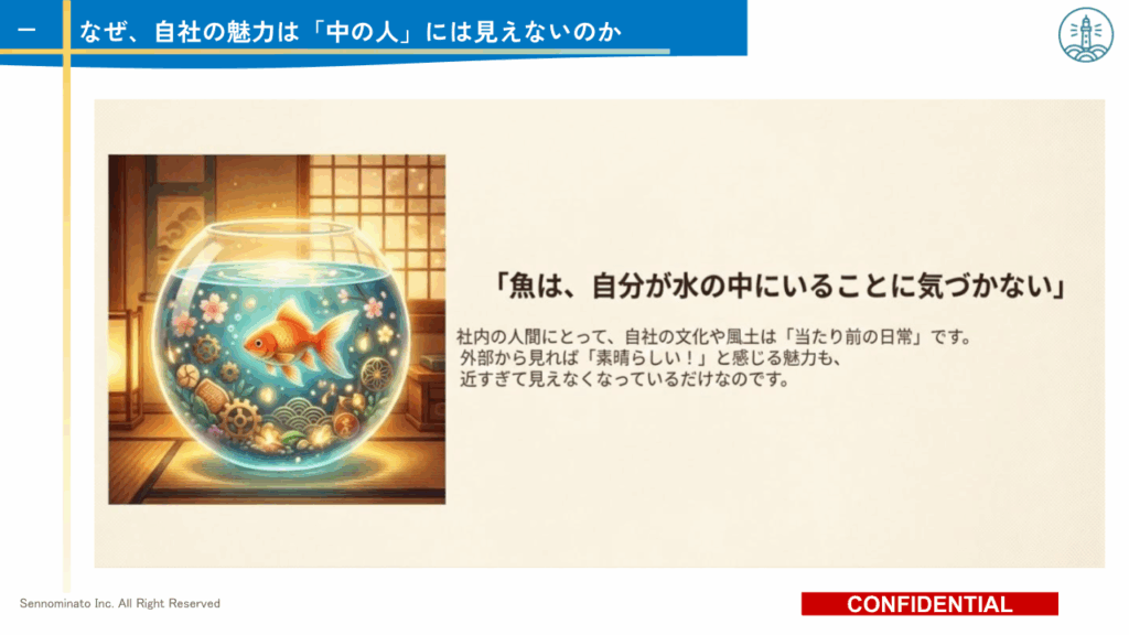 「魚は、自分が水の中にいることに気づかない」という言葉があります。 毎日その環境で過ごしている経営者や社員にとって、自社の文化や風土は、空気のように「当たり前の日常」になっています。だからこそ、外部の人から見れば「素晴らしい!」と感じるポイントでも、「え?こんなことが魅力になるの?」とスルーしてしまうのです。