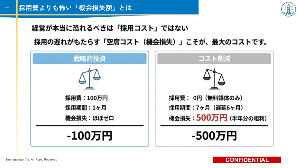 - 空席コスト(リスク): 必要な人材が採用できないことで失う利益(機会損失)